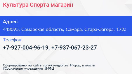 Культура Спорта, магазин по адресу 443095, Самарская область, Самара, Стара-Загора, 172а в дальнейшем Организация, размещена в следующих категориях: