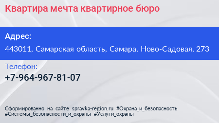Квартира мечта!, квартирное бюро по адресу 443011, Самарская область, Самара, Ново-Садовая, 273 в дальнейшем Организация, размещена в следующих категориях: