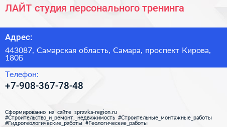 ЛАЙТ, студия персонального тренинга по адресу 443087, Самарская область, Самара, проспект Кирова, 180Б в дальнейшем Организация, размещена в следующих категориях: