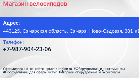Магазин велосипедов по адресу 443125, Самарская область, Самара, Ново-Садовая, 381 к1 в дальнейшем Организация, размещена в следующих категориях: