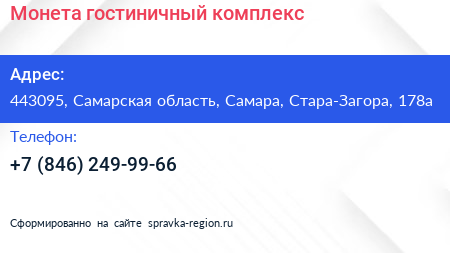 Монета, гостиничный комплекс по адресу 443095, Самарская область, Самара, Стара-Загора, 178а в дальнейшем Организация, размещена в следующих категориях: