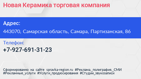Новая Керамика, торговая компания по адресу 443070, Самарская область, Самара, Партизанская, 86 в дальнейшем Организация, размещена в следующих категориях:
