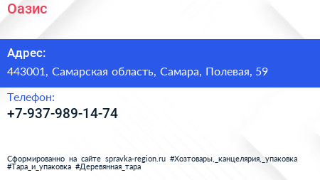 Оазис по адресу 443001, Самарская область, Самара, Полевая, 59 в дальнейшем Организация, размещена в следующих категориях: