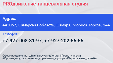 PROдвижение, танцевальная студия по адресу 443067, Самарская область, Самара, Мориса Тореза, 144 в дальнейшем Организация, размещена в следующих категориях: