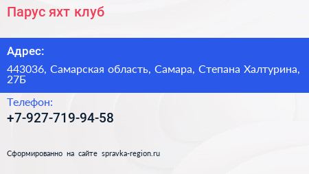 Парус, яхт-клуб по адресу 443036, Самарская область, Самара, Степана Халтурина, 27Б в дальнейшем Организация, размещена в следующих категориях:
