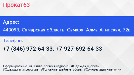 Прокат63 по адресу 443098, Самарская область, Самара, Алма-Атинская, 72в в дальнейшем Организация, размещена в следующих категориях: