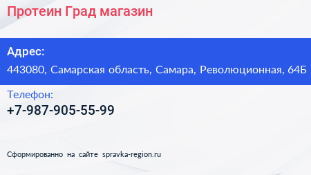 Протеин-Град, магазин по адресу 443080, Самарская область, Самара, Революционная, 64Б в дальнейшем Организация, размещена в следующих категориях: