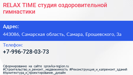 RELAX TIME, студия оздоровительной гимнастики по адресу 443086, Самарская область, Самара, Ерошевского, 3а в дальнейшем Организация, размещена в следующих категориях: