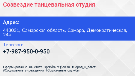 Созвездие, танцевальная студия по адресу 443031, Самарская область, Самара, Демократическая, 24а в дальнейшем Организация, размещена в следующих категориях: