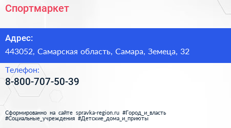 Спортмаркет по адресу 443052, Самарская область, Самара, Земеца, 32 в дальнейшем Организация, размещена в следующих категориях: