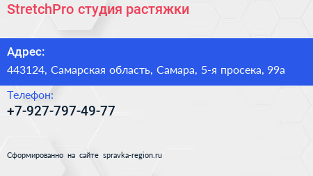 StretchPro, студия растяжки по адресу 443124, Самарская область, Самара, 5-я просека, 99а в дальнейшем Организация, размещена в следующих категориях:
