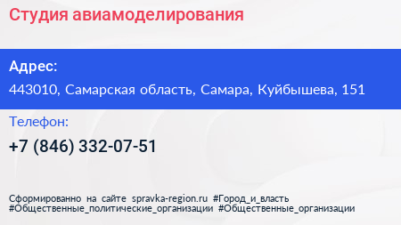 Студия авиамоделирования по адресу 443010, Самарская область, Самара, Куйбышева, 151 в дальнейшем Организация, размещена в следующих категориях: