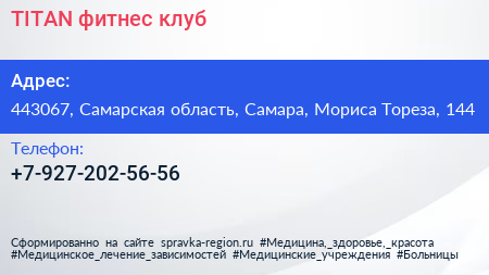 TITAN, фитнес-клуб по адресу 443067, Самарская область, Самара, Мориса Тореза, 144 в дальнейшем Организация, размещена в следующих категориях: