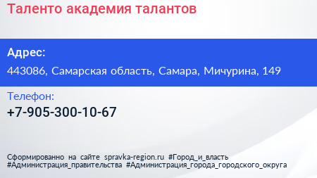 Таленто, академия талантов по адресу 443086, Самарская область, Самара, Мичурина, 149 в дальнейшем Организация, размещена в следующих категориях: