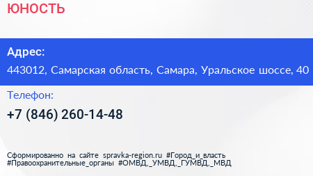 ЮНОСТЬ по адресу 443012, Самарская область, Самара, Уральское шоссе, 40 в дальнейшем Организация, размещена в следующих категориях: