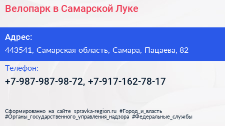 Велопарк в Самарской Луке по адресу 443541, Самарская область, Самара, Пацаева, 82 в дальнейшем Организация, размещена в следующих категориях: