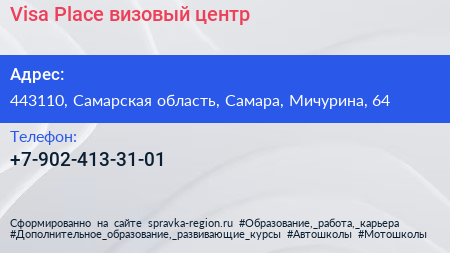 Visa Place, визовый центр по адресу 443110, Самарская область, Самара, Мичурина, 64 в дальнейшем Организация, размещена в следующих категориях: