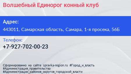 Волшебный Единорог, конный клуб по адресу 443011, Самарская область, Самара, 1-я просека, 56Б в дальнейшем Организация, размещена в следующих категориях: