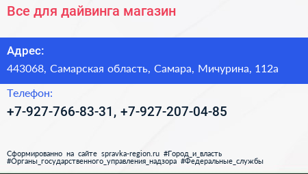 Все для дайвинга, магазин по адресу 443068, Самарская область, Самара, Мичурина, 112а в дальнейшем Организация, размещена в следующих категориях: