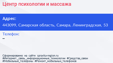 Центр психологии и массажа по адресу 443099, Самарская область, Самара, Ленинградская, 53 в дальнейшем Организация, размещена в следующих категориях: