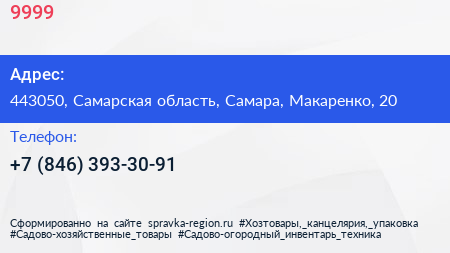 9999 по адресу 443050, Самарская область, Самара, Макаренко, 20 в дальнейшем Организация, размещена в следующих категориях: