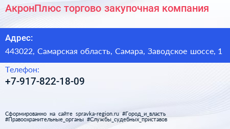 АкронПлюс, торгово-закупочная компания по адресу 443022, Самарская область, Самара, Заводское шоссе, 1 в дальнейшем Организация, размещена в следующих категориях: