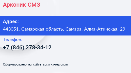 Арконик СМЗ по адресу 443051, Самарская область, Самара, Алма-Атинская, 29 в дальнейшем Организация, размещена в следующих категориях: