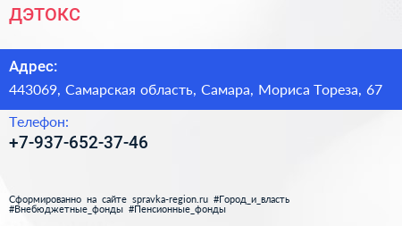ДЭТОКС по адресу 443069, Самарская область, Самара, Мориса Тореза, 67 в дальнейшем Организация, размещена в следующих категориях: