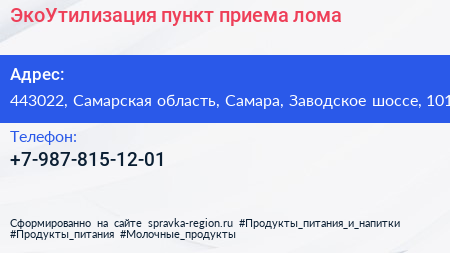 ЭкоУтилизация, пункт приема лома по адресу 443022, Самарская область, Самара, Заводское шоссе, 101 в дальнейшем Организация, размещена в следующих категориях: