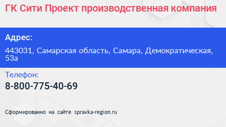 ГК Сити Проект, производственная компания по адресу 443031, Самарская область, Самара, Демократическая, 53а в дальнейшем Организация, размещена в следующих категориях: