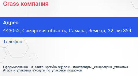 Grass, компания по адресу 443052, Самарская область, Самара, Земеца, 32 лит354 в дальнейшем Организация, размещена в следующих категориях: