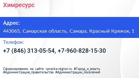 Химресурс по адресу 443065, Самарская область, Самара, Красный Кряжок, 1 в дальнейшем Организация, размещена в следующих категориях: