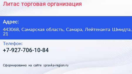 Литас, торговая организация по адресу 443068, Самарская область, Самара, Лейтенанта Шмидта, 21 в дальнейшем Организация, размещена в следующих категориях: