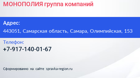 МОНОПОЛИЯ, группа компаний по адресу 443051, Самарская область, Самара, Олимпийская, 153 в дальнейшем Организация, размещена в следующих категориях: