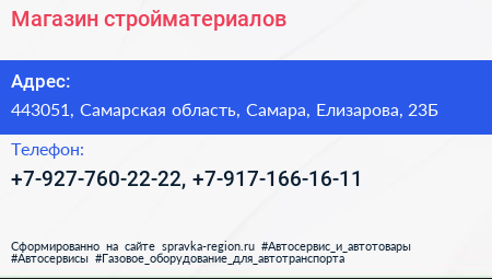 Магазин стройматериалов по адресу 443051, Самарская область, Самара, Елизарова, 23Б в дальнейшем Организация, размещена в следующих категориях: