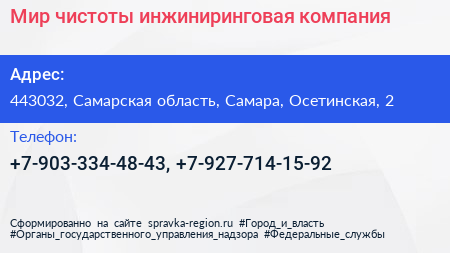 Мир чистоты, инжиниринговая компания по адресу 443032, Самарская область, Самара, Осетинская, 2 в дальнейшем Организация, размещена в следующих категориях: