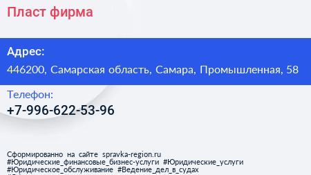Пласт, фирма по адресу 446200, Самарская область, Самара, Промышленная, 58 в дальнейшем Организация, размещена в следующих категориях: