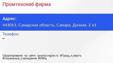 Промтехснаб, фирма по адресу 443013, Самарская область, Самара, Дачная, 2 к1 в дальнейшем Организация, размещена в следующих категориях: