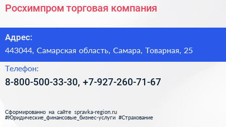 Росхимпром, торговая компания по адресу 443044, Самарская область, Самара, Товарная, 25 в дальнейшем Организация, размещена в следующих категориях: