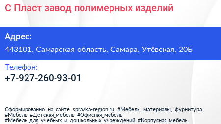 С-Пласт, завод полимерных изделий по адресу 443101, Самарская область, Самара, Утёвская, 20Б в дальнейшем Организация, размещена в следующих категориях: