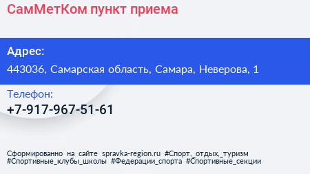 СамМетКом, пункт приема по адресу 443036, Самарская область, Самара, Неверова, 1 в дальнейшем Организация, размещена в следующих категориях: