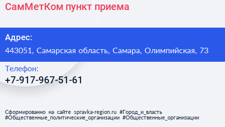 СамМетКом, пункт приема по адресу 443051, Самарская область, Самара, Олимпийская, 73 в дальнейшем Организация, размещена в следующих категориях: