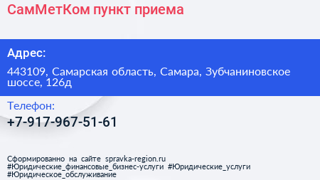 СамМетКом, пункт приема по адресу 443109, Самарская область, Самара, Зубчаниновское шоссе, 126д в дальнейшем Организация, размещена в следующих категориях: