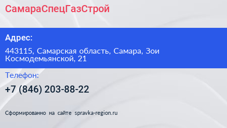 СамараСпецГазСтрой по адресу 443115, Самарская область, Самара, Зои Космодемьянской, 21 в дальнейшем Организация, размещена в следующих категориях: