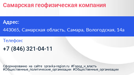 Самарская геофизическая компания по адресу 443065, Самарская область, Самара, Вологодская, 14а в дальнейшем Организация, размещена в следующих категориях: