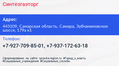 Синтезгазторг по адресу 443109, Самарская область, Самара, Зубчаниновское шоссе, 179а к1 в дальнейшем Организация, размещена в следующих категориях: