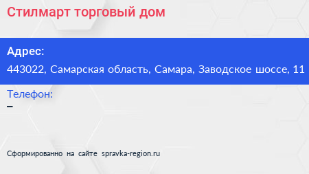 Стилмарт, торговый дом по адресу 443022, Самарская область, Самара, Заводское шоссе, 11 в дальнейшем Организация, размещена в следующих категориях: