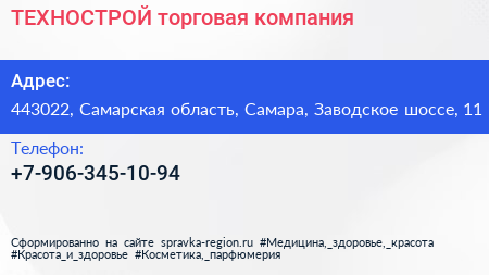 ТЕХНОСТРОЙ, торговая компания по адресу 443022, Самарская область, Самара, Заводское шоссе, 11 в дальнейшем Организация, размещена в следующих категориях: