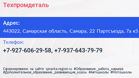 Техпромдеталь по адресу 443022, Самарская область, Самара, 22 Партсъезда, 7а к5 в дальнейшем Организация, размещена в следующих категориях: