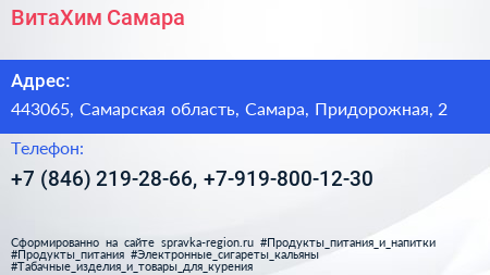 ВитаХим Самара по адресу 443065, Самарская область, Самара, Придорожная, 2 в дальнейшем Организация, размещена в следующих категориях: